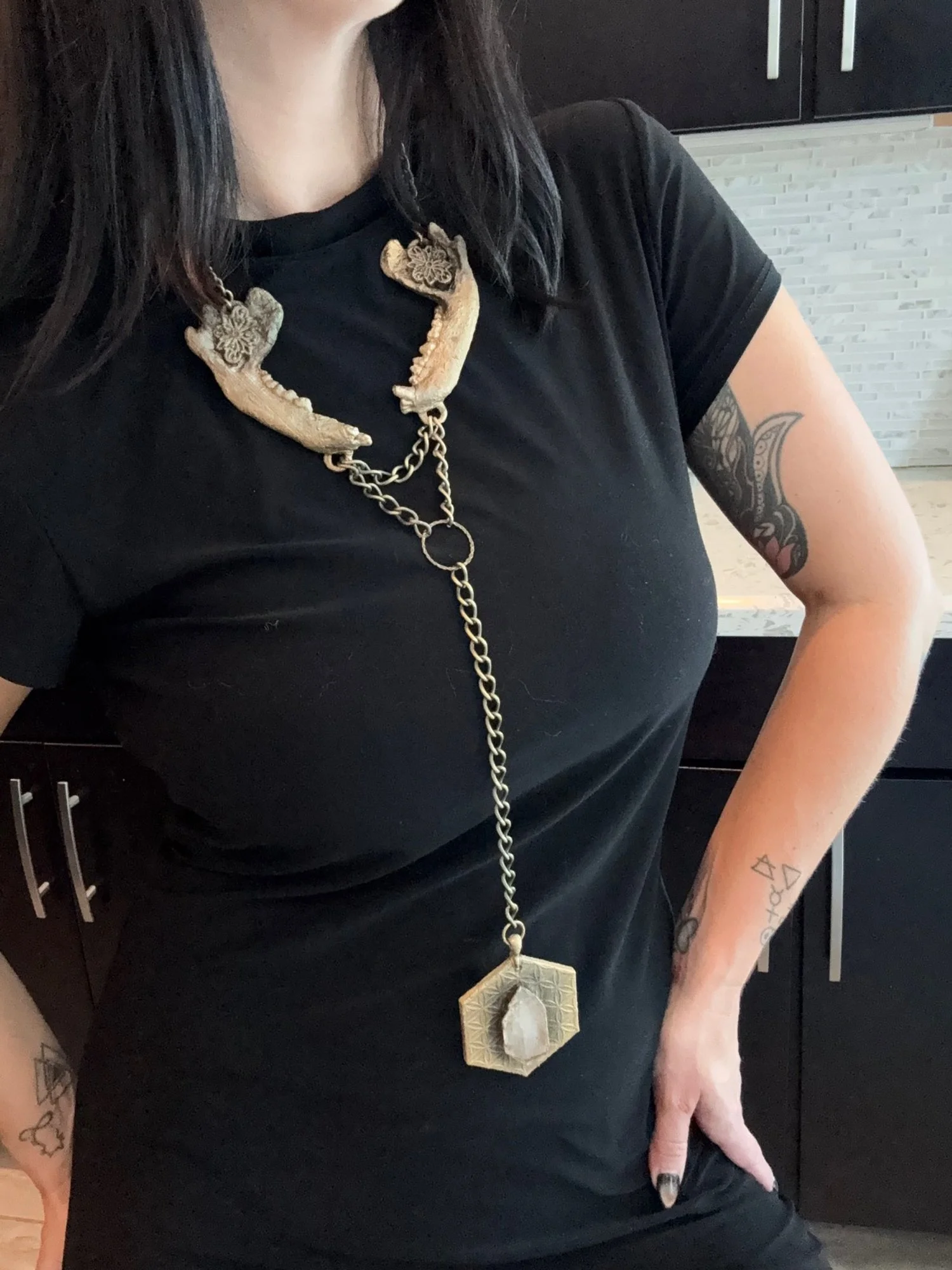 Copper plated Raccoon jaw bone statement necklace, worn to stand out. Complete with Quartz flower of life pendant. This necklace is one of a kind, completely unique. Comes with a brass chain necklace. Jaw bones are ethically sourced.